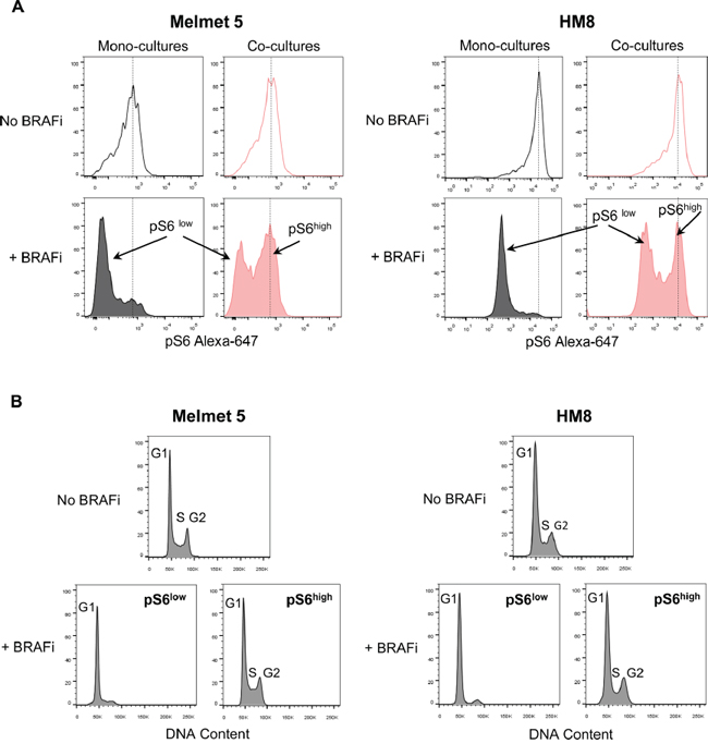 Figure 7: Flow cytometric analysis of pS6 levels and cell cycle in melanoma cells from mono-cultures and co-cultures with fibroblasts. Melanoma cells were grown as mono-cultures or co-cultures with fibroblasts, treated with 1 μM BRAFi for 24 h (controls were not treated) before the total cell suspension was analyzed for pS6 levels (A) and cell cycle (B). A. Representative histograms indicating pS6 levels in single melanoma cells; dotted lines designate the histogram peak position in the non-treated cells. B. DNA content (i.e. cell cycle distribution) in non-treated and BRAFi treated melanoma cells from the co-cultures, where the latter were divided into subpopulations with low (pS6low) and high (pS6high) levels of pS6.