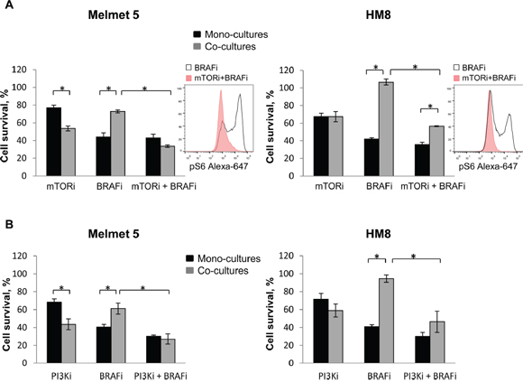 Based on the pS6 data, we hypothesized that mTORC1, or it activating pathways, might contribute to fibroblast-mediated protection from BRAFi. To test this hypothesis we employed an mTOR inhibitor, everolimus (mTORi) in combination with the BRAFi and compared the response in the mono-cultures versus the co-cultures with fibroblasts. We showed that mTORi+BRAFi treatment of the co-cultures eradicates a subpopulation of pS6high melanoma cells (Figure 10A, insert). Consequently, the melanoma cell survival in the co-cultures was significantly reduced after mTORi+BRAFi compared to BRAFi alone. Thus, the survival benefit that we saw in the co-cultures treated with BRAFi alone was eliminated (Melmet 5) or significantly diminished (HM8) after co-administration of mTORi (Figure 10A). A similar potentiation of the drug effect in the co-cultures was observed when BRAFi was combined with a pan-PI3K inhibitor, LY294002 (PI3Ki) (Figure 10B). It should be noted that mTORi/PI3Ki also affected fibroblasts, reducing their number by ~25% (data not shown). To compensate for this effect, the number of fibroblasts was increased by 25% in the co-cultures where mTORi/PI3Ki was applied. Thereby, we can exclude the possibility that the potentiated effects in the co-cultures might be due to fewer fibroblasts. It is interesting to note that the effect of the single agents, mTORi or PI3Ki, was stronger in the co-cultures than the mono-cultures of Melmet 5, suggesting that the co-cultured cells might be more dependent on PI3K-mTOR signaling.