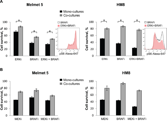 Figure 11: ERK or MEK inhibitor does not eliminate the protective influence of fibroblasts in the co-cultures. Melanoma cells were grown as mono-cultures or co-cultures with fibroblasts and treated with 0.5 μM BRAFi (A, B), 10 nM ERKi (A), 0.5 μM MEKi (B) or the combination as indicated (A, B). The level of pS6 in the co-cultures was analyzed after 24 h treatment by flow cytometry (histogram inserts). Melanoma cell survival/growth was scored after 72 h by measuring bioluminescence and relating the signal in the treated cells to the signal in the non-treated controls (set to 100). Data indicates average ± SEM (n=5 in A), or ± St. Dev. (from three parallels in a single experiment in B). *, p<0.05 (unpaired t-test).