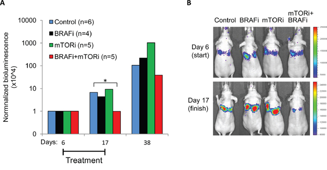 Figure 12: Treatment effect on lung metastases in vivo. Melmet 5 cells were injected into mice i.v. and were allowed to grow for 6 days before initiation of the treatment with a vehicle (control), 50 mg/kg BRAFi, 5 mg/kg mTORi or a combination of both drugs every weekday until day 17, when the treatment was stopped. Tumor burden was scored at days 6 (start), 17 (finish) and 38 (post-treatment) by live imaging in vivo, measuring bioluminescence (p/s/cm2/sr) in the IVIS Spectrum instrument. A. The bioluminescence signal at days 17 and 38 was normalized to the signal at day 6 (for the non-normalized data, see Supplementary Figure S7). The number of animals per group is indicated in the legend. *, p<0.05 (unpaired t-test). B. Representative IVIS pictures showing the animals at the start and the end of the treatment.