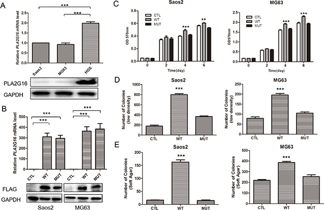 Figure 1: Overexpression of PLA2G16 increases osteosarcoma cell proliferation, clonogenicity and anchorage-independent colony formation. (A) PLA2G16 expression levels in osteosarcoma cell lines as determined by qRT-PCR (upper) and western blotting analyses (lower). (B) PLA2G16 or PLA2G16-C113S overexpression levels in Saos2 and MG63 cells as determined by qRT-PCR (upper) and western blot (lower) analyses. MTT analysis (C), Low density colony formation (D) and soft agar assays (E) were performed with PLA2G16 or PLA2G16-C113S overexpression cells. Results are shown as the mean ± SD of three independent experiments and one way ANOVA was used to determine the statistical significance between PLA2G16 overexpression (WT) and empty vector pBABE-puro (CTL) cells. ** indicates p < 0.01; *** indicates p < 0.001; CTL, pBABE-puro; WT, pBABE-FLAG-PLA2G16; MUT, pBABE-FLAG-PLA2G16-C113S.