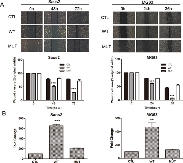Our previous work indicated that Pla2g16 can promote tumor progression and metastasis in mouse osteosarcoma cells [28]. Additionally, we demonstrated that increased PLA2G16 expression in osteosarcoma is associated with metastasis and poorer survival [29]. Thus, to further examine what metastatic properties can be induced by PLA2G16 overexpression and investigate the underlying mechanisms, we engineered overexpression and knockdown models of PLA2G16 in human osteosarcoma cell lines. We first examined the endogenous expression level of PLA2G16 in Saos2, MG63, and HOS cells. In comparison to Saos2 and MG63, HOS cells showed higher mRNA and protein expression of PLA2G16 by both the real time quantitative PCR and western blot analyses respectively (Figure 1A). We then generated Saos2 and MG63 cell lines with stable overexpression PLA2G16 (WT) or PLA2G16-C113 (MUT). The C113 mutation has a loss of lipase function mutation at amino acid 113 and is used to determine if the lipase activity is required [12, 13]. PLA2G16 and PLA2G16-C113 expression were significantly increased at both the mRNA and protein levels in Saos2 and MG63 cells (Figure 1B). MTT assays were performed to determine the effect of PLA2G16 overexpression to cell proliferation. These results indicate that PLA2G16 overexpression significantly enhances cell proliferation in both cell lines when compared to both empty vector control (CTL) and the lipase-deficient mutant PLA2G16-C113 (Figure 1C). Moreover, low-density colony formation assays clearly demonstrate that PLA2G16 overexpression increases the clonogenic survival of cells (Figures 1D and S1A). In addition, we also carried out a soft agar colony formation assay to examine the effect of PLA2G16 overexpression on anchorage-independent cell growth. Overexpression of PLA2G16 caused a significant increase in both the number and size of the colonies in Saos2 and MG63 cells while overexpression of PLA2G16-C113 had no effect (Figures 1E and S1B). Additionally cell migration and invasion were evaluated by wound-healing and Matrigel transwell assays, respectively. Saos2 and MG63 cells with PLA2G16 overexpression showed a significant increase in migration (Figure 2A) and invasion (Figure 2B), while overexpressing of PLA2G16-C113 had no effect (Figures 2A, 2B, S2). Notably, as the proliferation of PLA2G16 overexpressing cells did not show significant difference during the first 48 hours (Figure 1C), and the cells were incubated with medium without FBS in the migration and invasion assays, it is unlikely that proliferation rates influenced migration and invasion. Combined these data strongly support that PLA2G16 overexpression contributes to human osteosarcoma progression and metastasis, and this activity is dependent on the lipase activity.