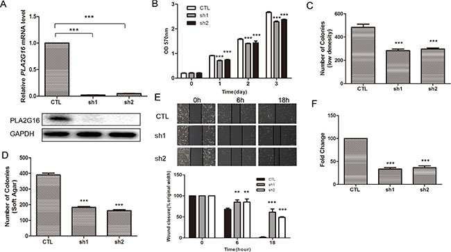 Figure 3: Knockdown of PLA2G16 decreases osteosarcoma cell proliferation, clonogenicity, anchorage-independent colony formation, migration and invasion. (A) PLA2G16 expression in HOS cells with shRNA knockdown was determined by qRT-PCR (upper) and western blot (lower) analyses. MTT analyses (B), low density colony formation (C), Anchorage-independent growth (D), wound-healing (E) and Matrigel transwell (F) assays were performed in HOS cells with PLA2G16 knockdown. The colonies were counted from low density colony formation and soft agar assays after incubation and staining. Results are shown as the mean ± SD of three independent experiments and One way ANOVA was used for statistical analyses to compare sh1 or sh2 knockdown to control cells ** indicates p < 0.01; *** indicates p < 0.001; sh1 and sh2 were shRNAs against PLA2G16.