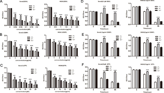 Figure 4: Overexpression of PLA2G16 decreases sensitivity to anticancer drugs in a dose- and time-dependent manner. Cells were plated into 96-well plates and incubated with different concentration of doxorubicin (DOX) (A), cisplatin (CDDP) (B) and etoposide (ETP) (C) for 48 hours. Cells were incubated with DOX (D) or CDDP (E) and ETP (F) for different time period before the addition of MTT. The absorbance of 570 nm was measured after 4 hours with MTT. Results are shown as the mean ± SD of three independent experiments and One way ANOVA was used to determine the statistical significance between PLA2G16 overexpression (WT) and empty vector pBABE-puro (CTL) cells ** indicates p < 0.01; *** indicates p < 0.001.