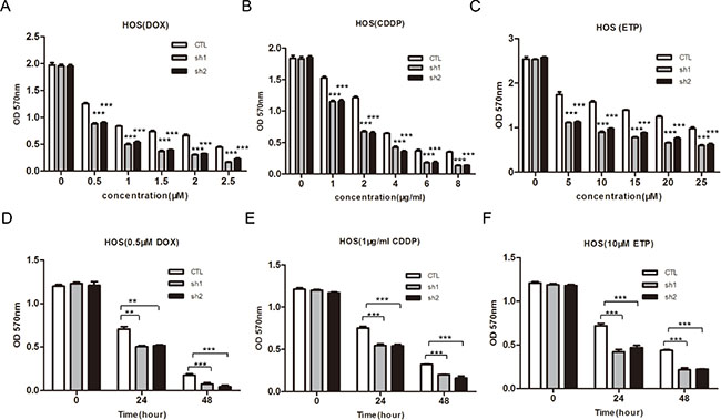 Figure 5: Knockdown of PLA2G16 enhances sensitivity to anticancer drugs in dose-and time-dependent manner in HOS cells. (A–F) Cells were incubated with different concentration of DOX, CDDP and ETP for 48 hours or treated with DOX, CDDP and ETP for indicated time respectively before cells viability was determined by MTT assay. Results are shown as the mean ± SD of three independent experiments. One way ANOVA was used for statistical analyses to compare sh1 or sh2 knockdown to control cells ** indicates p < 0.01; *** indicates p < 0.001.