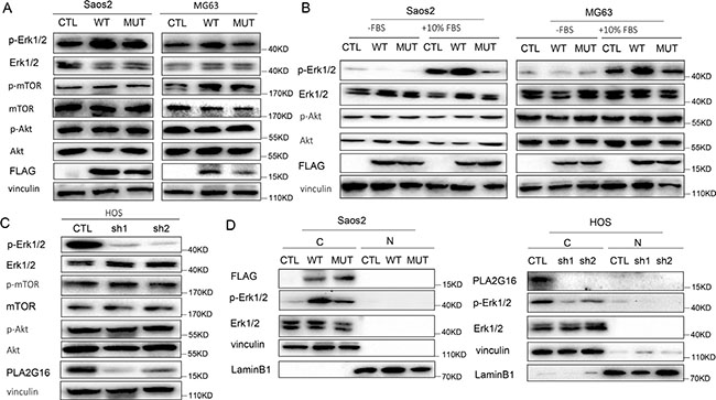 Previously, the function of PLA2G16 in tumor development was reported to be associated with its intracellular localization. Nuclear localized PLA2G16 has been shown to have tumor suppressive activity whereas a cytoplasmic localized PLA2G12 has oncogenic effects [27]. Therefore, we extracted the cytoplasm and nuclear fractions from Saos2 and HOS cell respectively to determine localization of PLA2G16. Interestingly, we found that PLA2G16 was largely cytoplasmic and associated with higher phosphorylation of ERK1/2 (Figure 6D), consistently with the study in NSCLC [27].
