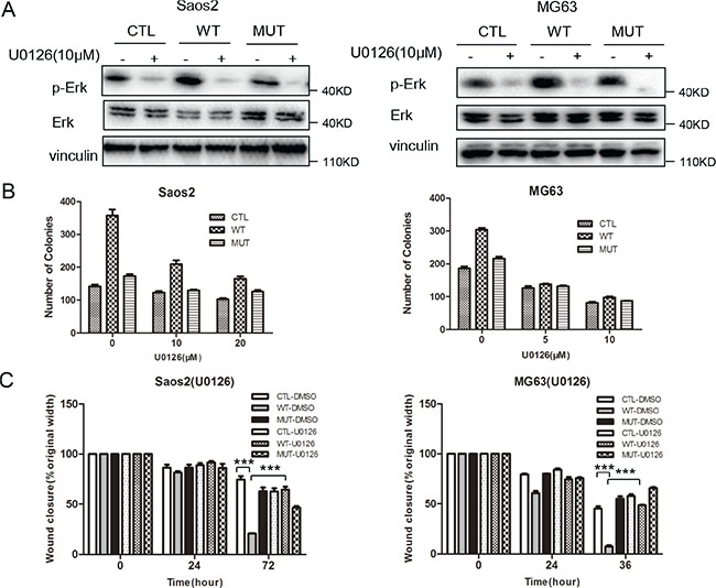 To determine the functional relevance of MAPK pathway activation mediated by PLA2G16 expression in osteosarcoma progression, we used U0126 monoethanolate (a MEK specific inhibitor) to inhibit the phosphorylation of ERK1/2 (Figure 7A) and examined the clonogenic survival and migration abilities in Saos2 and MG63 cells. The low-density colony formation assays showed that the colongenicity induced by PLA2G16 overexpression was specifically inhibited by U0126 both in Saos2 (from 2.15 fold induction reduced to 1.70 fold under 10 μM and 1.60 under 20 μM) and MG63 cells (from 1.64 fold induction reduced to 1.06 fold under 5 μM and 1.19 fold under 10 μM) (Figure 7B and Figure S5A). Wound-healing assays showed migration was similar among PLA2G16 (WT), PLA2G16-C113 (MUT) or the control vector (CTL) cell lines in the presence of U0126 (Figure 7C and Figure S5B), indicating U0126 also specifically inhibited the migration induced by PLA2G16 overexpression. Thus, our data demonstrated that PLA2G16 may function as an oncogene in part by activating MAPK pathway.