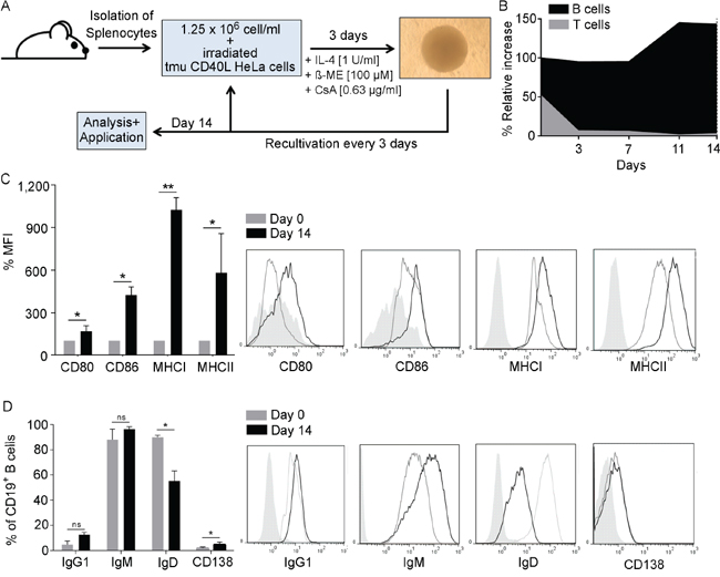 Figure 1: B cells develop an APC-phenotype upon CD40L activation. A. In the optimal CD40-culture system splenocytes are co-cultured together with CD40L-expressing HeLa cells in the presence of IL-4, ß-mercaptoethanol (ß-ME) and Cyclosporin-A (CsA). Cells are recultivated every 3 days and analyzed or used for experiments after 14 days. B. At every recultivation day the relative increase was assessed by normalizing the relative growth to the percentage of CD3+ and CD19+ cells in the culture as determined by flow cytometry. (n=5). CD40B cells were phenotypically characterized on day 14 by measuring C. the mean fluorescence intensity (MFI) of the activations markers CD80 and CD86 and the MHC molecules I and II D. or the expression of different immunoglobulin subtypes and CD138. MFI values on day 14 were normalized to values on day 0. Significant differences calculated by Student’s t-test are indicated by an asterisk: * p ≤ 0.05, ** p ≤ 0.01, ns = not significant. Histograms show representative analyses compared to an unstained control (filled line). Results of five independent experiments are shown.