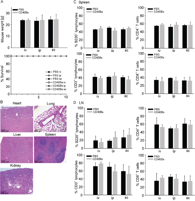 Figure 3: Immunization with CD40B cells does not lead to in vivo toxicity. B6 mice were challenged with either CD40B cells or PBS alone as negative control in three different routes; i.e. intravenous (iv), intraperitoneal (ip) or subcutaneous (sc). Five weeks after CD40B cell injection they were analyzed for indications of toxicity. A. The weight of the mice and the survival over a period of ten days were documented. Mean values ± SD of four independent experiment with five mice per group are shown. B. H&E stained sections of heart, lung, liver, spleen and kidney were analyzed. Representative pictures out of four independent experiments are shown. C. Spleens of mice were analyzed by flow cytometry for B220+ B cells or CD3+ T cells and the T cell subpopulations CD4+ and CD8+ cells. Mean values ± SD of four independent experiment with five mice per group are shown. D. Mesenteric and inguinal lymph nodes (LN) of mice were analyzed by flow cytometry for B220+ B cells or CD3+ T cells and the T-cell subpopulations CD4+ and CD8+ cells. Mean values ± SD of four independent experiment with five mice per group are shown.