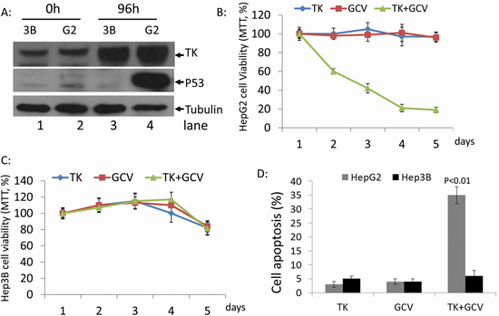 Figure 1: Effect of rAdV-TK/GCV on HepG2 cells (p53 wild-type) and Hep3B cells (p53 null). A. Western blotting was used to evaluate the levels of TK and p53 in HepG2 and Hep3B cells at 0 and 96 hours. The survival rates of B. HepG2 and C. Hep3B cells following rAdV-TK and GCV treatment for 1 to 5 days, as measured by MTT assay. D. Apoptosis analysis of HepG2 and Hep3B cells following rAdV-TK/GCV treatment on day 4.