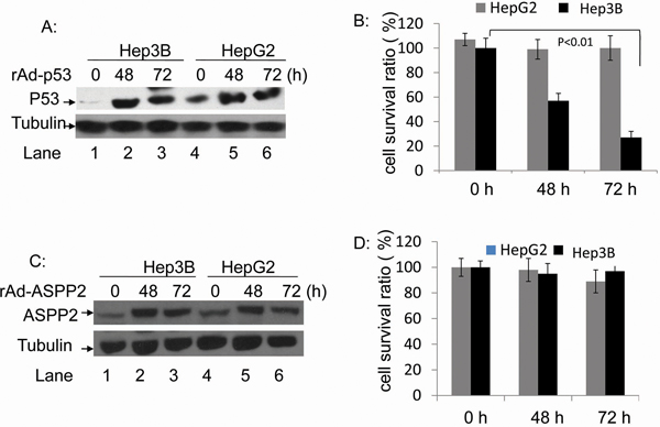 Figure 2: The rAdV-p53- and rAdV-ASPP2-induced cell death in HepG2 and Hep3B cells. A. Western blotting analysis of p53 overexpression following rAdV-p53 infection and C. ASPP2 overexpression following rAdV-ASPP2 infection. B. MTT assay results of cell survival rate in HepG2 and Hep3B cells following rAdV-p53 infection and D. rAdV-ASPP2 infection.