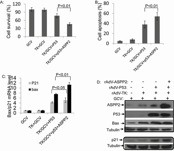 Figure 5: Combining p53 with ASPP2 promotes rAdV-TK/GCV-induced death in Hep3B (p53 null) cells. A. Cell survival rate and B. apoptosis rate in Hep3B cells with rAdV-p53, rAdV-ASPP2, and rAdV-TK/GCV. C. mRNA levels of p21 and Bax after treatment with GCV alone, rAdV-TK/GCV, rAdV-p53 and rAdV-TK/GCV, or rAdV-P53, rAdV-ASPP2, and rAdV-TK/GCV treatment. D. Protein levels shown by Western blotting assay.