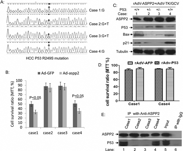 Figure 6: ASPP2 can enhance the therapeutic effect of rAdV-TK/GCV on primary cultured wild-type p53 HCC cells. A. p53 gene sequences in four HCC cases, including two p53 wild-type primary HCC cells (cases 1 and 4) and two p53 R249S mutant primary HCC cells (cases 2 and 3). B. Comparison of rAdV-GFP- and rAdV-ASPP2-induced death in rAdV-TK/GCV-treated primary HCC cells. C. Bax and p21 levels in rAdV-ASPP2 and rAdV-TK/GCV-treated primary HCC cultures. D. Comparison of rAdV-GFP- and rAdV-p53-induced death in P53 wild-type primary HCC cells (cases 1 and 4). E. Co-immunoprecipitation results confirm that ASPP2 binds with p53 after rAdV-TK/GCV treatment in cases 1 and 4, but not in cases 2 and 3.