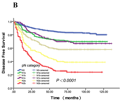 Figure 1: The DFS and OS curves for npN and pN categories. A. The 5-year DFS rates of npN0-2b were 83.6%, 72.4%, 65.6%, 45.7%, 26.0%,respectively (P < 0.0001), and the 5-year DFS rates of each group from npN 0 to 2b were different (all P < 0.05). B. The 5-year DFS rates of pN0-2b were 83.6%, 71.4%, 57.8%, 69.9%, 39.5%, and 25.8%, respectively (P < 0.0001). pN1a and 1c had similar 5-year DFS rates (P = 0.862). C. The 5-year OS rates of npN0-2b were 87.9%, 76.2%, 69.1%, 57.9% and 37.1%, respectively (P < 0.0001), and the 5-year DFS rates of each group from npN 0 to 2b were different (all P < 0.05). D. The 5-year OS rates of pN0-2b were 87.9%, 74.3%, 64.8%, 75.2%, 50.1% and 32.9%, respectively (P < 0.0001), and the 5-year DFS rates of each group from pN 0 to 2b were different (all P < 0.05). Of note, pN1c had a similar 5-year OS rate with pN1a (P = 0.303).