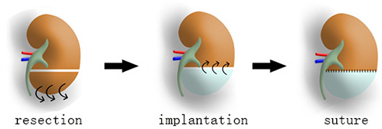 Figure 1: DC scaffold implantation into resected kidney in vivo. First, lower 1/3 of the left renal parenchyma is transected. Then a similar size-scaffold (white part of the middle kidney) is grafted onto the cut-end by suture.