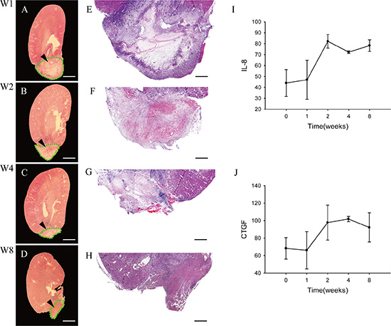 Figure 2: Pathologic changes of the implanted graft. (A–D) Longitudinal cross-sections of whole experimental kidneys are observed under stereoscopic microscope on week 1 (A), 2 (B), 4 (C) and 8 (D). The structures that bold green dotted line indicate to are the residue of implanted DC kidney scaffolds. (E–H) Light microscopic examinations show the cellular pathologic results of the implanted grafts on week 1 (E), 2 (F), 4 (G) and 8 (H), respectively. On week 1, the outline of the implanted scaffold can be distinguished. The outer portion of the scaffold is infiltrated by massive inflammatory cells, while the inner part is not. On week 2, inflammatory cells also infiltrate deeply into the inner medulla. On week 4, the implanted graft becomes smaller, and the contour of inner and outer parts are not visible andinflammatory cells decrease also. On week 8, the implanted graft lost its original contour, with granulation tissue forming. (I–J) ELISA assay shows level of two cytokines IL-8 and CTGF in the implanted graft over time. Scale bar: A–D = 625 μm; E–H = 250 μm.