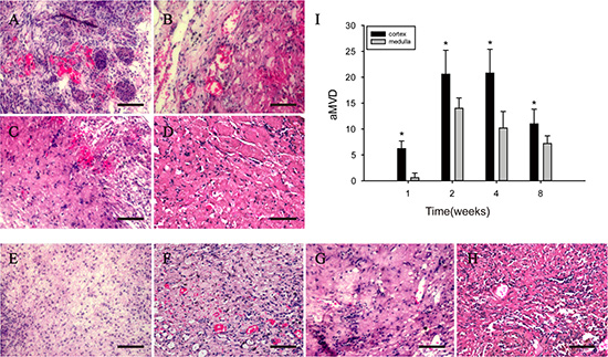 To examine cellular pathologic changes of the implanted graft in more detail, some rats were sacrificed on 1, 2, 4 and 8 weeks post-operation, and their kidneys were collected for analysis. As shown in Figure 2A–2H, the implanted graft became smaller in appearance over time. On week 1 and 2, the outline of the scaffold was relatively clear, as shown by the appearance of accumulated cells in the outer portion and less cells in the inner part of graft. These cells appeared to be inflammatory cells that infiltrated into the DC scaffold. Since week 4, the contour of the scaffold was still visible, but the difference between the outer and inner parts was not obvious, and on week 8 there were granulation-like tissue in the scaffold (Figure 2H).