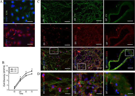 Figure 5: Proliferation of human umbilical vein endothelial cells (HUVEC) in the DC kidney scaffolds in vitro. (A) Immunofluorescence identification of KDR (green) and CD31 (red) in HUVEC. (B) CCK-8 proliferation assay shows that comparing with those without scaffolds, cells seeding on the scaffolds proliferate highly at day 1, 3 and 7 after seeding on the scaffold. There is statistical difference in proliferate ability between cells with and without DC scaffolds. (C) Double immunofluorescence shows the scaffold and the HUVEC with fibronectin (green) and CD31 (red), respectively. On the first day after seeding on the scaffold, a small number of HUVECs adheres to the scaffold. On the third day, adhered HUVECs are increased. On the seventh day, HUVECs adhere to the wall of median renal vessel-like structure in the scaffolds. (D) The magnification pictures show the white squares in Figure. C. *p < 0.05 Scale bar: A = 12.5 μm, C =50 μm D = 12.5 μm.