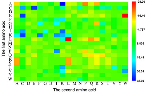 Figure 1: A heat map or chromaticity diagram for the F values of the 400 1-gap dipeptides. The blue boxes indicate that the features are enriched in anticancer peptide, while the red boxes indicate that the features are enriched in non-anticancer peptide. See the text for more explanation.