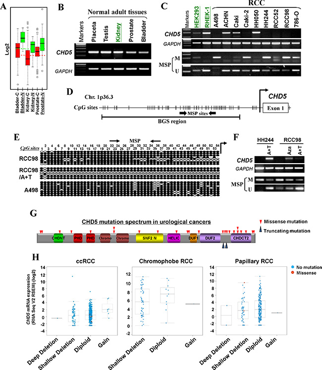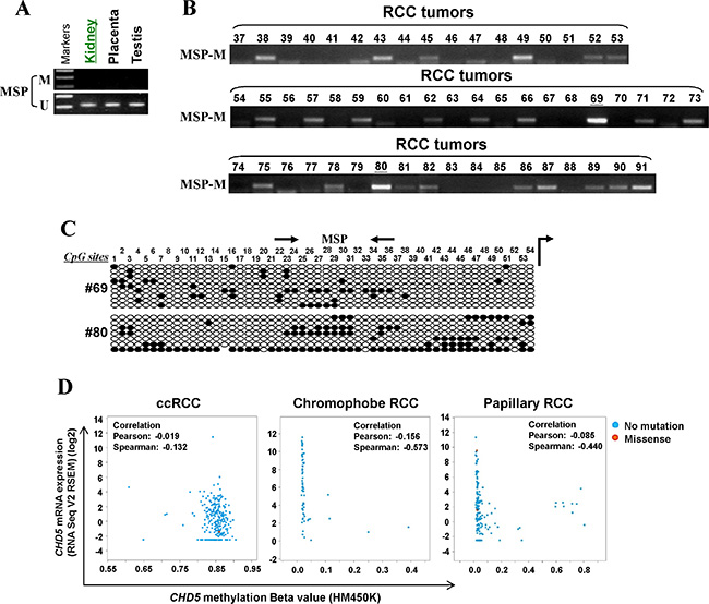 Figure 2: CHD5 is methylated in primary RCC tissues. (A) MSP analysis of CHD5 methylation in normal urological tissues. (B) Representative MSP analysis of CHD5 methylation in RCC tissues. All these samples have been shown to have sufficient bisulfite converted DNA by unmethylation detection for TSGs. (C) BGS analysis confirmed CHD5 methylation in two representative primary RCC tissues. (D) CHD5 methylation was observed in all of ccRCC (320/320), 3.0% (2/66) chromophobe RCC and 4.1% (12/292) in papillary RCC primary tumors from TCGA RCC cohorts.