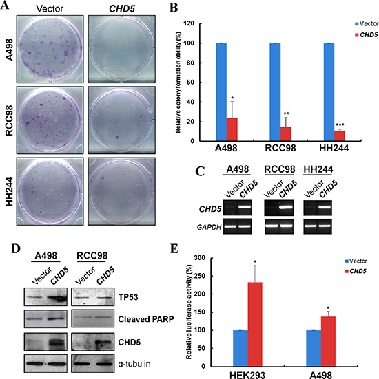 Figure 3: CHD5 suppresses RCC cell growth and induced TP53-related apoptosis. (A) Representative monolayer culture colony formation assay of A498, RCC98 and HH244 cells. (B) Quantitative analysis of colony numbers. Data are presented as mean ± SD of three independent experiments. *P < 0.05, **P < 0.01 ***P < 0.001. (C) Restored expression of CHD5 in transfected cell lines as confirmed by RT-PCR. (D) Western blot showed upregulation of cleaved PARP and TP53 in CHD5-expressing RCC cells. α-tubulin was used as a loading control. (E) CHD5 expression can increase the transcription activity of TP53-binding site promoter construct as determined by luciferase reporter assay in HEK293 and A498 cell lines. *P < 0.05.