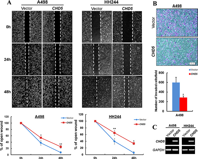 Figure 4: CHD5 inhibits the migration and invasion of RCC cells. (A) Wound healing assay demonstrated a slower wound closure of CHD5-expressing A498 and HH244 cells compared with controls. *P < 0.05; **P < 0.01. (B) Transwell migration assay of CHD5-expressing tumor cells. Migrated cells at the lower surface of the transwell filter were stained (up panel) and counted (bottom panel). *P < 0.05. (C) Expression of CHD5 in transfected cell lines was confirmed by RT-PCR.