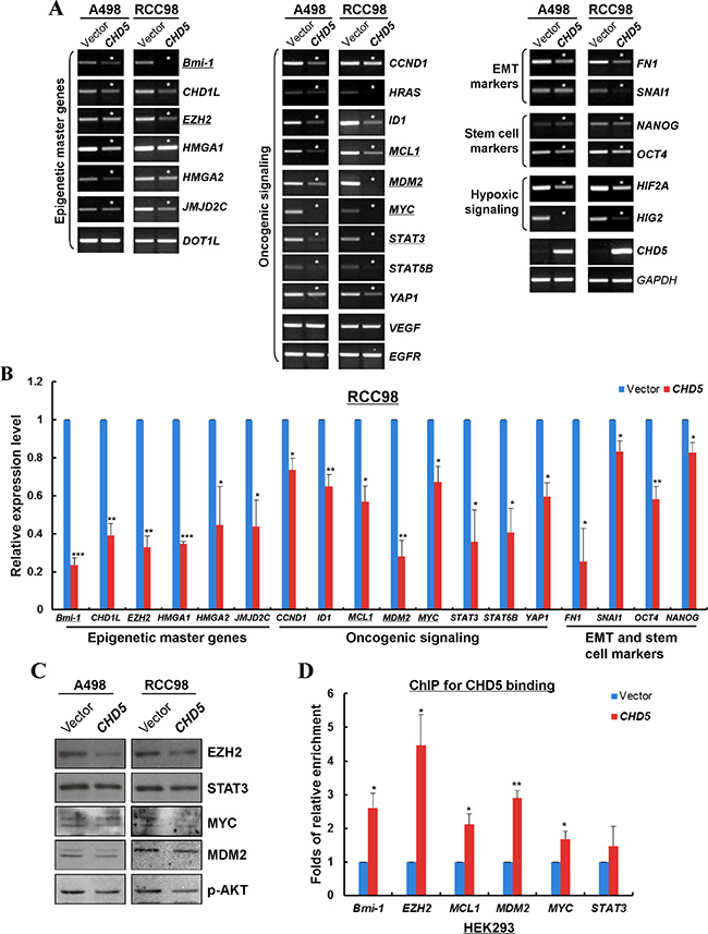 Figure 5: CHD5 represses the expression of multiple cancer genes through direct interaction with their promoters. (A) Semi-quantitative RT-PCR showed that CHD5 repressed the mRNA expression of multiple oncogenic genes in A498 and RCC98 cells. Asterisk (*) indicates significantly downregulation effects. (B) qRT-PCR showed that CHD5 inhibited the expression levels of multiple cancer genes in RCC98 cells, including epigenetic master genes, hypoxia-inducible factors, oncogenic genes, EMT and stem cell markers. *P < 0.05; **P < 0.01; ***P < 0.001. (C) Western blot showed decreased levels of EZH2, STAT3, MYC, MDM2 and p-AKT by CHD5. Gel loading control is the same as in Figure 3D. (D) ChIP-qPCR showed enrichment of CHD5 binding to the promoter regions of EZH2, MYC, MDM2, BMI1 and MCL1 in HEK293 cell lines. *P < 0.05; **P < 0.01.