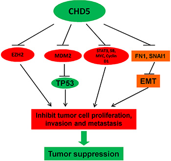 Figure 6: Proposed model of the tumor suppressive functions of CHD5 in RCC. CHD5 promotes TP53-related apoptosis and suppresses multiple cancer gene expression (EZH2, MYC and MDM2, etc), leading further to tumor suppression.