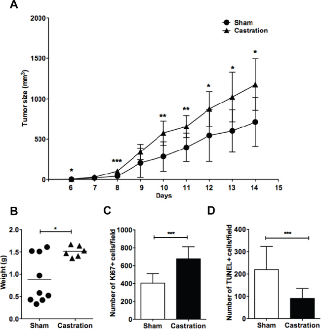 Previous results have shown that grafted EG7 lymphoma grows faster in male vs. female mice. This difference was attributed to female sex hormones as it was abolished following ovariectomy [26]. Furthermore, estrogen administration inhibited lymphoma growth [16, 26]. However, a possible impact of also male sex hormones on lymphoma growth has not been elucidated. We therefore investigated whether removal of male sex hormones influenced lymphoma growth. Male C57BL6 mice were surgically castrated or sham-operated prior to grafting with EG7 murine T lymphoma cells. Compared to sham-operated mice, EG7 murine T cell lymphoma in castrated mice showed an accelerated growth (Figure 1A). At the end of the experiment, tumors removed from castrated mice had a significantly larger weight compared to sham-operated tumors (Figure 1B) and exhibited a higher number of proliferating tumor cells as assessed by Ki67 staining (Figure 1C). Furthermore, a significantly lower number of apoptotic cells, as determined by TUNEL-staining, were observed (Figure 1D). This suggests that castration and the removal of male sex hormones, similarly to the removal of female sex hormones by ovariectomy [26] induces lymphoma cell proliferation and inhibits apoptosis leading to an overall accelerated lymphoma growth.