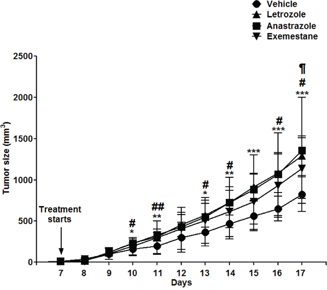 Figure 3: Several different aromatase inhibitors promote lymphoma growth in male NSG mice grafted with human mantle B cell lymphomas cells (Granta-519). Intact male NSG mice were grafted with human Granta-519 Mantle cell lymphoma cells and treated with different aromatase inhibitors, Letrozole (▲) (n=8), Anastrazole (■) (n=9), Exemestane (▼) (n=9) or vehicle (●) (n=9) from the time of development of palpable tumors. Tumor growth curves are shown.* p<0.05, ** p<0.01, ***p<0.001 vehicle vs. Letrozole, # p<0.05, ## p<0.01 vehicle vs. Anastrazole, ¶ p<0.05 vehicle vs. Exemestane. No significant difference in lymphoma tumor growth was seen between any of the aromatase inhibitors. Data analyzed by 2-tailed Student t-test.