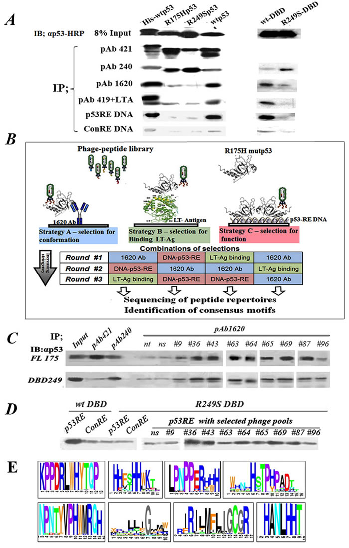 Figure 1: Outline of experimental rationale, calibration of conditions. A. IP-Western analysis of the binding of WTp53 and mutp53 to various markers distinguishing between WT and mutp53 conformations. 50ng of each purified protein was subjected for immunoprecipitation with a subset of different antibodies and proteins shown to bind differentially WTp53 or mutp53: PAb421 (binds both WT and mutant), PAb1620 (WT specific), PAb240 (mutant specific), PAb419+LTag (WT specific), biotinilated-p53RE DNA oligo (WT specific), and a control oligo mutated at two bases. Immunoprecipitated material was subjected to Western blotting using αp53-HRP as second antibody. B. Schematic diagram representing the protocol for identification, screening and selection of mutp53 reactivating peptides. The protocol consists of various selection strategies, at increasing stringencies, for screening and identifying mutp53 reactivating peptides, by utilizing phage display. Strategy A (left): Conformation-based selection: selection of peptides presented by a phage, which can bind a mutp53 protein bound to immobilized WTp53 conformation-specific antibody (PAb1620), thereby enabling selection of a bound phage capable of stabilizing WTp53 conformation. Strategy B (middle): selection according to binding: selection of peptides, which can bind a mutp53 protein bound to immobilized LT-antigen. Strategy C (right): selection according to function: selection of peptides binding to immobilized WTp53-p53RE DNA complex. C. Western blot analysis of IP with PAb1620 antibody of purified either p53R175H (upper panel) or p53R249S-DBD (lower panel) in the presence of selected phage pools. Non-selected phage (ns) and no phage (nt) were used as controls. Incubation was for 3 hours at 4oC. Bound p53 in the immunoprecipitate (IP) was analyzed by Western blot using antibody against p53 (αp53). “In” stands for 10% of the IP input material, loaded directly on the gel. D. Western blot analysis of IP experiments of streptavidin-coated beads bound either to p53RE-DNA or control-RE-DNA oligonucleotides labeled with biotin were incubated with purified WTp53-DBD or mutant p53R249S-DBD in the presence of phage selected by phage display. Non selected phage (ns) were used as control. Incubation was for 3 hours at 4oC. E. A schematic illustration of several consensus peptide motifs identified as described.