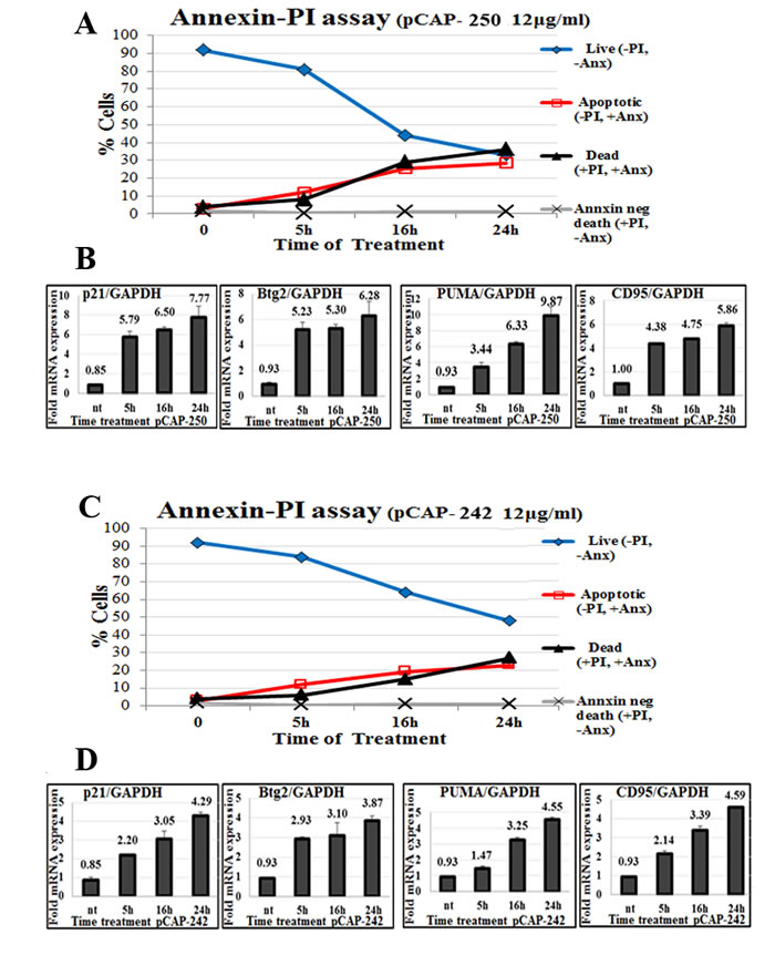 To assess whether pCAPs can trigger apoptosis in mutp53 expressing cells, we subjected non-fixed ES2 cells to Annexin V staining in conjunction with propidium iodide (PI). In such analysis, cells negative for both PI and Annexin V (-PI, -Annexin) are considered live, cells negative for PI and positive for Annexin V (-PI, +Annexin) are going through early stages of apoptosis, cells positive for PI and Annexin V (+PI, +Annexin) are considered already dead by apoptosis, and cells positive for PI and negative for Annexin V (+PI, -Annexin) are assumed to have undergone non-apoptotic death. As seen in Figure 4A and 4C, pCAP-250, and to a somewhat lesser extent pCAP-242, elicited a rapid increase in apoptotic cells followed by cell death, along with significant transactivation of WTp53 target genes (Figures 4B, 4D).