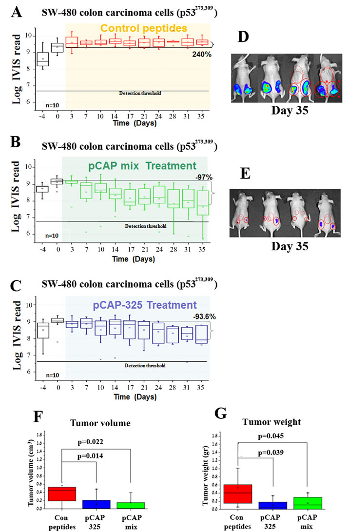 Figure 6: Effect of lead peptides on tumor progression in vivo; colon cancer xenograft model. In vivo effect of the indicated peptides in a mouse xenograft model of SW-480 colon cancer cells. 106 cells were injected and tumors were allowed to establish for 10 days. Mice were then randomly divided into 3 groups and injected intratumorally, three times a week, with either a mixture of 3 control peptides (pCAPs 76, 77 and 12; 2µg of each peptide), a mixture of 3 test peptides that exhibited mutp53-reactivating ability (pCAPs 250, 308 and 325; 2µg of each peptide) or pCAP-325 (6µg) . A.-C. - Logarithmic scale graph demonstrating the average luciferase readings in tumors as a function of time, before and after initiation of treatment (colored background). D., E. - Live imaging of control group mice (D) and the group treated with peptide mix (E) at termination of the experiment (day 35). G., H.- Box plot of tumor volume and weight, respectively.
