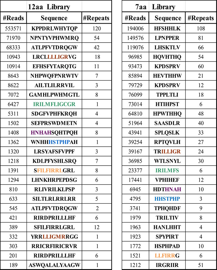 After filtering out irrelevant sequences, our database contained 107 sequences in total. Table 1 shows the top list of deduced peptide sequences. The sequences are divided by their two libraries of origin, namely 12aa and 7aa. #Reads indicates the number of times the particular sequence appears in the database, indicating its extent of enrichment; sequences are sorted in descending order according to the number of reads. Since the bioinformatics analysis was performed on the DNA sequences and because of the genetic code degeneracy, some peptide sequences appear in Table 1 multiple times. #Repeats shows the number of non-identical DNA sequences in the database that code for the same peptide sequence, indicating independent selection of different phage clones.