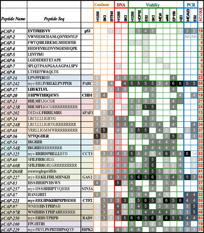 Results of a variety of functional assays performed on representative synthesized peptides, presented as a heat map. Peptides were evaluated for their effect in each assay and assigned a score and corresponding color according to performance compared to positive control (score 0- no effect-white – score 6- as or more effective than positive control- black). Assays included mutp53 conformation (orange), mutp53 DNA binding (red), viability of mutp53 expressing cells and induction of p53 target genes by qRT-PCR (blue). Peptide sequences are aligned and have a background color according to similarity to known p53 interacting proteins and to each other. Since we changed peptide sequences along the project, in an attempt to yield more effective sequences according to performance in the different assays, table 2 also reflects this “evolutionary” process. The first set of peptides (pCAPs 1-160) corresponded to sequences identified by phage display. Then, lead sequences were modified to resemble p53 interacting proteins. Additionally, Arginines and N-terminal myristoil were added to enhance delivery, giving rise to pCAPs 200-326. Highlighted amino acids are similar to motifs found in p53 interacting proteins.