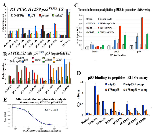 Figure 3 : Peptides binding to p53 and their effect on the expression of p53 target genes. A. - Bar graph illustrating the effect of selected peptides on activation of mutp53 by measuring transactivation of p53 target genes as determined by qRT-PCR. H1299 cells stably transfected with mutp53 (ts) A135V were used. The indicated peptides were added directly to the medium at a concentration of 5ug/ml and cells were then either moved to 32°C or returned to 37°C. 18 hours later cells were harvested, extracted for RNA, cDNA was synthesis subjected to qrt time PCR analysis. The expression level of 3 representative p53 target genes, p21, PUMA and Mdm2, were examined. The figure illustrates the relative fold induction of transcription of the cells treated with the selected peptides as compared to non-treated cells. B. - Bar graph illustrating the effect of selected peptides on activation of mutp53 by measuring transactivation of p53 target genes as determined by qRT-PCR. ES2and ES2-p53KO cells were treated with indicated peptides 5ug/ml, for 18 hours. Cells were harvested, and cDNA was subjected to qRT-PCR analysis. Expression of 4 representative p53 target genes, p21, PUMA, Mdm2 and CD95, was examined. The figure illustrates the relative fold induction of transcription in cells treated with the selected peptides compared to non-treated cells. C. - Binding of mutp53 to promoters of representative p53 target genes in live cells, assessed by chromatin immunoprecipitation. BT-549 breast cancer cells endogenously expressing mutant p53R249S were treated for 5 hours with a mix of 3 pCAPs - 250, 242 and 325. Cells treated with a mix of inert peptides served as a negative control. DNA cross-linked p53 was immunoprecipitated, and binding to the p53 responsive elements of the PUMA, p21, CD95 and MDM2 gene promoters was quantified by qPCR. Results were normalized to input total DNA. Cell extracts immunoprecipitated with beads without antibody (beads) served as negative controls. A genomic segment containing no p53RE served as negative control (white and gray bars). D. - ELISA analysis of the binding of WTp53 and mutp53 to lead peptides. Peptides were conjugated to the bottoms of the wells of 96 well plates, employing a commercial conjugation kit (TAKARA). Control wells were coated with the αp53 monoclonal antibodies PAb1801, PAb1620 and PAb240. Recombinant WTp53 or mutp53R175H was added to the wells and incubated with the bound peptides or antibodies. Where indicated, soluble peptides were added as competitors (+ comp), to confirm the specificity of the binding to p53. pCAP-76 served as a negative control peptide. After removal of recombinant protein, plates were washed and incubated with αp53-HRP followed by TMB and optical density determination. Results are presented as relative absorbance at 450nm. E. - Microscale thermophoresis (MST) analysis of the binding of fluorescently labeled WTp53 DBD and pCAP-250. See Materials and Methods for details.