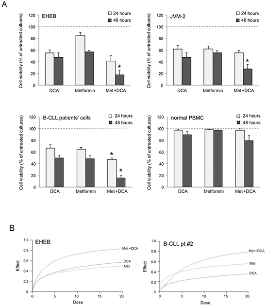 Figure 2: Evaluation of cell cytotoxicity in response to Metformin in combination with DCA in B-CLL leukemic cells. The B leukemic cell lines EHEB and JVM-2, B-CLL patients’ leukemic cells (n=5) and normal PBMC from healthy donors (n=3) were exposed to DCA (range of 0.2 to 20 mM) or Metformin (range of 0.1 to 10 mM) used either alone or in combination for 24 and 48 hours. In A. cell viability in response to Metformin (10 mM) and DCA (20 mM), used alone or in combination, was calculated as percentage with respect to the control vehicle cultures (set to 100% for each cell line). Data are reported as the mean±SD of results of at least three independent experiments; the asterisk indicates a significant difference (p<0.05) with respect to the treatment with the single agents. In B. dose-effect plots of drug efficacy, documenting a synergistic effect of the combination Metformin plus DCA, are shown for representative experiments performed on EHEB cells and on one B-CLL patient sample. The decrease of cell viability, labeled “effect” on the Y-axis, was determined in assays done at least twice and in duplicate.