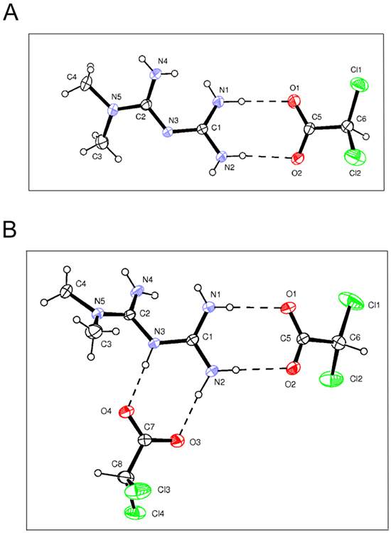 Figure 3: Structure of Metformin and DCA cocrystals. Drawings of Met-DCA 1:1 (MetH+•DCA−) A. and Met-DCA 1:2 (MetH2++•2DCA−) B. cocrystals are shown (ORTEP view with the thermal ellipsoids at 30% probability).