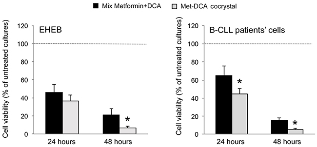 Figure 4: Comparative evaluation of the anti-leukemic activity of Metformin plus DCA (mix) and of the Met-DCA cocrystal MetH2++•2DCA−. The B leukemic cell lines EHEB and JVM-2 as well as B-CLL patients’ cells (n=5) were exposed to a mix of Metformin (10 mM) plus DCA (20 mM) or to the Met-DCA cocrystal MetH2++•2DCA− (10 mM) before analysis of cell viability at 24 and 48 hours. Cell viability was calculated as percentage with respect to the control vehicle cultures (set to 100%). Data are reported as the mean±SD of results from at least four independent experiments. The asterisk indicates a significant difference (p<0.05) with respect to the treatment with the mix. Considering that results were comparable in both cell lines, only EHEB results are shown as representative.