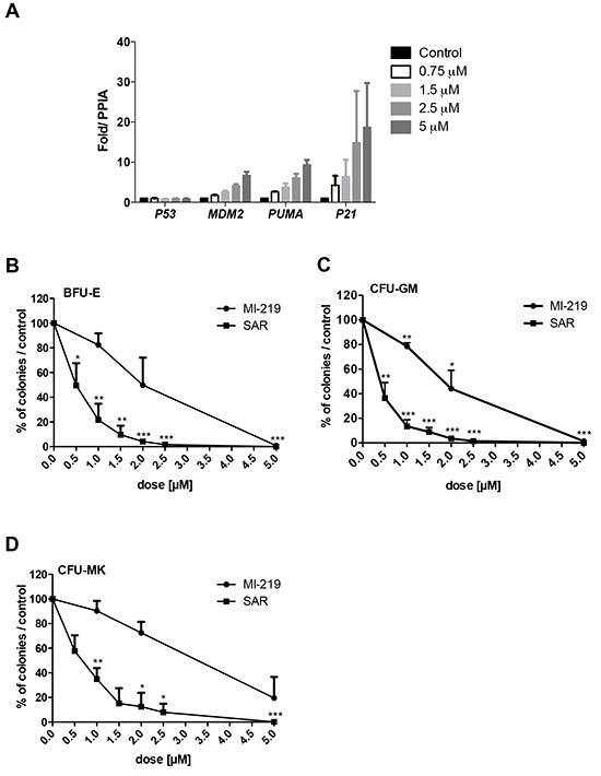 Figure 1: Effects of SAR405838 on CD34+ progenitors. A. Dose-effect of SAR405838 on p53 target genes by qRT-PCR. CD34+ cells were treated or not with SAR405838 at various doses (0.75 M, 1.5 μM, 2.5 μM and 5 μM). The expression of P53 and its targets (MDM2, PUMA, P21) were quantified by qRT-PCR related to PPIA. Results are the mean ± SEM of 2 independent experiments in duplicate. B, C, D. Cells were seeded in methylcellulose (B, C) or in fibrin clot (D) in the presence of MI-219 or SAR405838 to assay the number of BFU-E, CFU-GM and CFU-MK progenitors. Results are presented as percentage compared to control. Results represent the mean of 3 experiments for BFU-E and CFU-GM and 3 experiments for CFU-MK made in triplicate. * represents statistical significance using student t test (* P<0.05; **P<0.01; ***P<0.001).