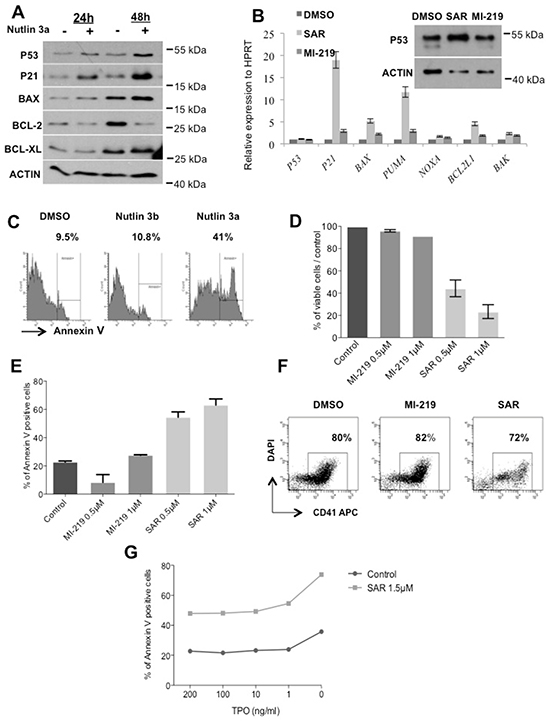 Figure 6: Effect of p53 reactivation on late stage of megakaryocytic differentiation. A. Day 10-MK treated with Nutlin 3a (5 μM for 24 hours or 48 hours) were analyzed for p53, p21, Bax, Bcl-2, Bcl-xL expression by western-blot. β-actin was used as loading control. B. Day 11-MKs treated with MI-219 or SAR405838 (5 μM for 24 hours) were analyzed for p53 expression by western-blot. β-actin was used as loading control. In parallel, the expression of P53, BAK, BCL2L1, NOXA, PUMA, BAX, P21 and P53 were quantified by qRT-PCR related to HPRT. C. Day 7-megakaryoblasts were exposed to 5 μM Nutlin 3a or Nutlin 3b for 24 hours and apoptotic cells were analyzed by flow cytometry using Annexin V assay. (n=3). D, E, F. Day 6-megakaryoblasts were exposed to MI-219 or SAR405838 (0.5 or 1 μM for 72 hours) and cell viability (D), apoptosis (E) or CD41 expression (F) were investigated. The results represent the mean of 2 experiments. * represents statistical significance (*P<0.05; **P<0.01; ***P<0.001). G. Day 6-megakaryoblasts were exposed to SAR405838 (1.5 μM for 48 hours) in the presence of various doses of TPO and apoptotic cells were analyzed by flow cytometry using annexin V assay. One representative experiment (n= 2).