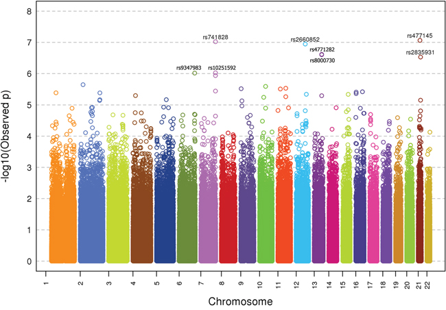 GWAS was successfully conducted on 515 CUP patients and 7226 healthy controls which passed all applied quality control criteria. A Manhattan plot of genotyped SNPs in CUP cases against controls is shown in Figure 1. Eight SNPs in six loci reached a significance level of p<10-6. The SNPs, including two linked SNPs on each of chromosomes 7 and 13, are listed by rs numbers in Figure 1.