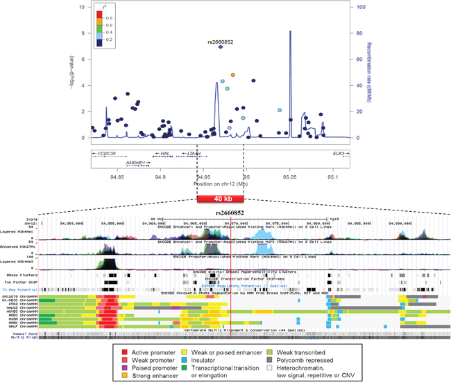 A regional association plot of rs2660852 on chromosome 12 is shown in Figure 2 from 515 CUP patients and 6227 healthy controls together with functional annotation based on the ENCODE data. The SNP is flanking 5’UTR of LTA4H next to a weak or poised enhancer and histone enhancer and promoter marks, constituting the regulatory elements of LTA4H.