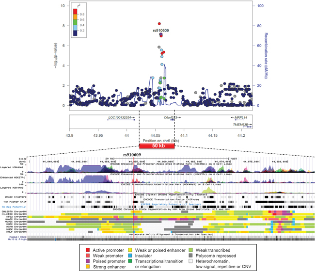 A regional association plot and functional annotation based on the ENCODE of rs910609 on the liver-specific association on chromosome 6 showed that the SNP was located in a poised promoter in the hepatocellular carcinoma (HepG2) cells and was mapped among enhancer and promoter histone marks in many cell lines (Figure 3). According to the Regulome and HaploReg data on rs910609, histone marks for chromatin remodeling are found for the liver, the SNP binds P300 and TCF4 and changes motif for AP-2rep (Supplementary Table S2).