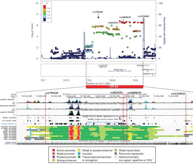 Figure 4: Regional association plot of the 4 SNP cluster on chromosome 11 from CUP patients with liver metastases and controls with functional annotation based on the ENCODE data.