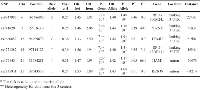 ORs and p-values of the six unlinked top SNPs (rs9347983, rs741828, rs2660852, rs4771282, rs477145 and rs2835931) are shown in Table 1. While rs9347983, rs741828, and rs4771282 were located either 3’ or 5’ to non-coding RNA genes, rs2660852 was located 5’ to LTA4H (leukotriene A4 hydrolase) on chromosome 12, rs477145 was intronic to TIAM 1 (T-cell lymphoma invasion and metastases) and rs2835931 was intronic to KCNJ6 (potassium channel, inwardly rectifying subfamily J, member 6), both on chromosome 21. Tests for heterogeneity of data from the three centers (p-value for Q > 0.05 and I2 < 75.0) showed no heterogeneity for the data on these six SNPs.