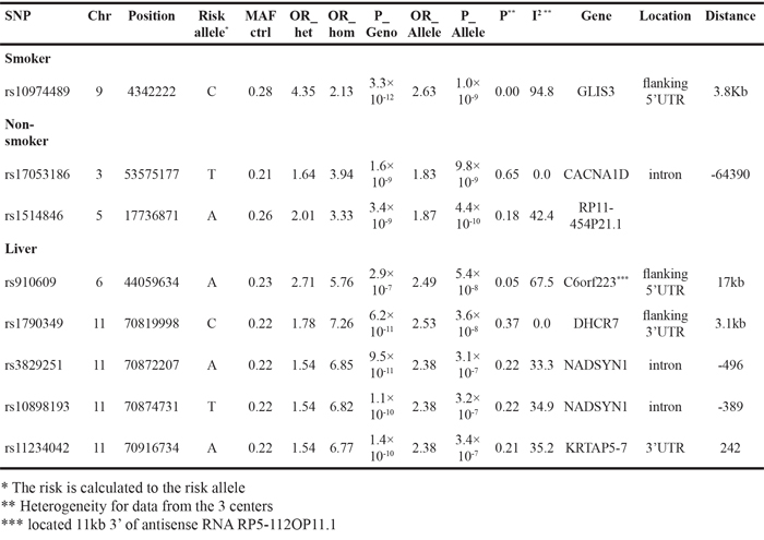 Among analysis of CUP subtypes the genome-wide significance was reached among smokers, non-smokers and patients with liver metastases. The GLIS3 gene that was detected among smokers is a transcription factor regulating the development of liver, kidney and pancreatic beta cells; it is associated with diabetes and also with liver cancer [27].