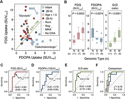 First, FDGhi, FDOPAlo is associated with unfavorable clinical characteristics but also with the poor-risk Seg+ and MNA+ genomic types, indicating a strong relationship between metabolic patterns on PET and underlying tumor biology. Although data on age, stage, histopathology, and MYCN amplification can be confidently obtained in most clinical settings [24], the detection of Seg+, that accounts for 37% of NB and confers a dismal outcome [3], requires time- and resource-consuming pangenomic methods or multiple in situ hybridizations [22]. The proposed “PET-UHR” criteria yielded a positive predictive value of 92.9% in predicting Seg+ or MNA+, providing a convenient parameter of the underlying tumor biology for patients undergoing diagnostic PET scans. Furthermore, area under the ROC curve of G:D is larger than that of FDG or FDOPA uptake alone in classifying the unfavorable genomic types, indicating that combining the information of FDG and FDOPA uptake may serve as a useful biomarker to predict the underlying tumor biology in NB.