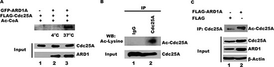 Figure 2: ARD1 acetylates Cdc25A in vitro and in cells. (A) ARD1 mediates Cdc25A acetylation in vitro. Purified GFP-ARD1A was incubated at 4°C, or 37°C, with purified FLAG-Cdc25A. The reactions were analyzed using anti-acetyl lysine antibody, followed by chemiluminescent detection. (B) Cdc25A is endogenously acetylated. Cdc25A was immunoprecipitated from HEK 293T cell lysates and its acetylation status was analyzed by Western blot using an acetyl-specific antibody. (C) ARD1 overexpression increases Cdc25A acetylation in cells. Cdc25A was immunoprecipitated from HEK 293T cell lysates transfected with FLAG-ARD1A and the Cdc25A acetylation status was analyzed by Western blot using an antibody specific for acetylated lysines.