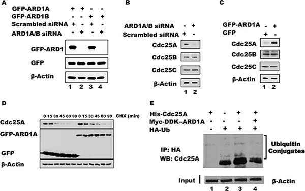 Figure 3: ARD1 expression affects Cdc25A protein stability by modulating its ubiquitination. (A) ARD1 knockdown efficiency. HEK 293 cells were transfected with siRNA against ARD1A/B or with scrambled siRNA as control to establish ARD1 knockdown. (B) ARD1A/B knockdown induces a reduction in Cdc25A level, but not of Cdc25B or Cdc25C. (C) Overexpression of ARD1 in HEK 293 cells increases the level of Cdc25A but not of Cdc25B, and Cdc25C. (D) ARD1 increases Cdc25A half-life. HEK 293 cells were transfected with GFP vector of GFP-ARD1A followed by treatment of cells with CHX for the indicated time. Cell lysates were analyzed by Western Blot with anti-Cdc25A, anti-GFP, and anti-β-actin antibodies. (E) ARD1 decreases Cdc25A ubiquitination. Cell lysates from HEK 293T were incubated with HA-Ub, His-Cdc25A, and/or Myc-DDK-ARD1. After immunoprecipitation with an anti-HA antibody, the immonoprecipitates were subjected to Western blot analysis using an anti-Cdc25A antibody.